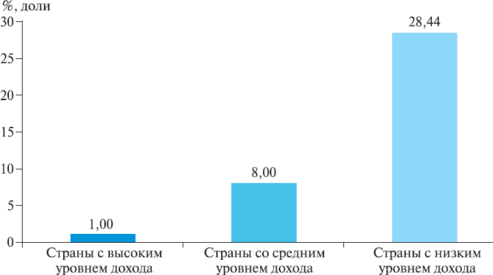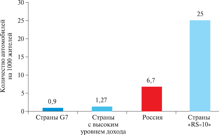 Прежде всего бросается в глаза огромный разрыв между «эпидемиологическими очагами» смертности на дорогах и местами наибольшей концентрации автомобилей – потенциальных носителей этой специфической «инфекции». Большинство (91,5 %) случаев смерти на дорогах происходит в странах с низким и средним доходом, на долю которых приходится менее половины (48 %) мирового парка транспортных средств (рис. 6, 7). При этом около 51,2 % зарегистрированных дорожно-транспортных травм со смертельным исходом происходит в странах группы «Risky States-10» («RS-10»). В последние годы Всемирной организацией здравоохранения реализуется проект «RS-10», который направлен на снижение смертности на дорогах в странах, входящих в эту группу, и спонсируется благотворительным фондом Bloomberg Philanthropies. В группу «RS-10» входят: Китай, Индия, Бразилия, Камбоджа, Египет, Кения, Мексика, Турция, Вьетнам, Россия. А это 48,5 % населения мира, на которые приходится 38,7 % мирового парка автомобилей (см. табл. 1).