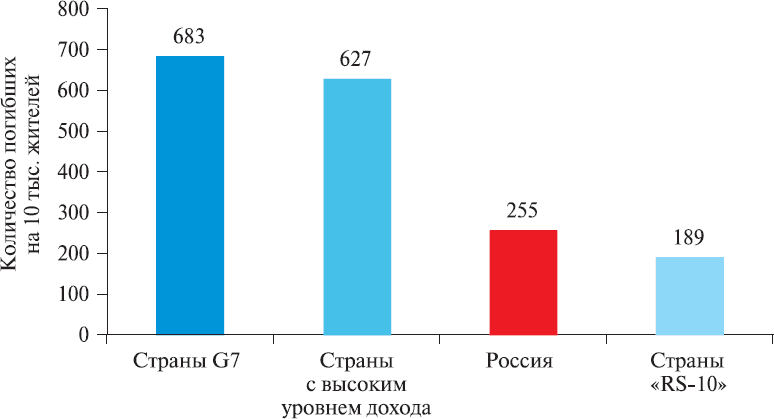 Самый распространенный и общедоступный показатель «эпидемиологической опасности» автомобиля – уровень транспортных рисков (traffic risks – RT), исчисляемый количеством погибших в расчете на 10 тыс. автомобилей (рис. 2–4).