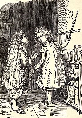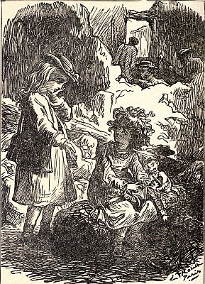 There was a thunder and a whizzing in the air and a sharp rattling noise besides; a strange, damp, unwholesome smell too, mixed with that of gunpowder; and when Lucy looked up, she found herself down some steps in a dark, dull, vaulted-looking place, lined with stone, however, and open to the street above. A little lamp was burning in a corner, piles of straw and bits of furniture were lying about, and upon one of the bundles of straw sat a little rough-haired girl.