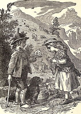 She read Mount Blanc, Mount Cenis, the Wengern, and so on; and of course as she read and sung them over to herself, they lulled her off into her wonderful dreams, and brought her this time into a meadow, steep and sloping, but full of flowers, the loveliest flowers, of all kinds, growing among the long grass that waved over them. The fresh clear air was so delicious that she almost hoped she was gone back to her dear Tyrol; but the hills were not the same. She saw upon the slope quantities of cows, goats, and sheep, feeding just as on the Tyrolese Alps; but beyond was a dark row of pines, and up above, in the sky as it were, rose all round great sharp points—like clouds for their whiteness, but not in their straight jagged outlines; and here and there the deep grey clefts between seemed to spread into white rivers, or over the ruddy purple of the half-distance came sharp white lines darting downwards.