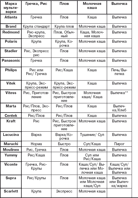 Таблица соответствия режимов разных мультиварок