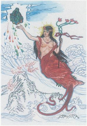 И Нюйва в мгновение ока примчалась на землю. Она облетела весь свет, и всюду царили пожары и наводнения. При виде того, как ее дети плачут среди воды, огня и рыскающих хищников, ее лицо исказилось от боли, а из глаз хлынули слезы.