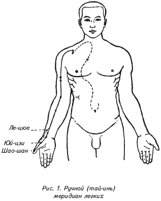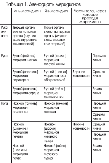 Циркуляция энергии в организме человекаЧеловеческий организм имеет специальную систему, которая соединяет поверхность тела с внутренними органами и верхнюю часть тела с нижней и связывает все твердые и полые органы. Меридианы и коллатерали не являются ни кровеносными сосудами, ни нервами. Термин «меридиан» (цзин) имеет смысл «маршрута». Меридианы также называются проводниками энергии. Они образуют магистральные линии. Термин «коллатераль» (ло) имеет смысл сети. Коллатерали – ветви меридианов. Меридианы и коллатерали оплетают все тело и приводят его в органическое единство путем соединения его различных частей. Имеется двенадцать регулярных меридианов – двенадцать меридианов, ведущих к твердым и полым органам. Их природа выражается в терминах Инь и Ян. Те меридианы, что, соединяя твердые органы, проходят вдоль внутренних боковых поверхностей тела, называются инь-меридианами. Те же, что соединяя полые органы, проходят вдоль внешних боковых поверхностей тела, называются ян-меридианами. Согласно природе внутренних органов и маршрутов, которыми они следуют, меридианы подразделяются на три ручных инь-меридиана, три ножных инь-меридиана и три ручных и три ножных ян-меридиана (табл. 1).