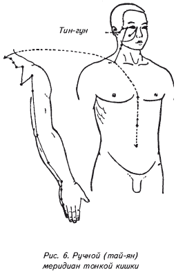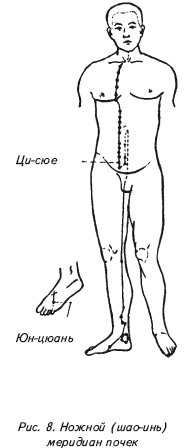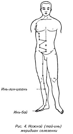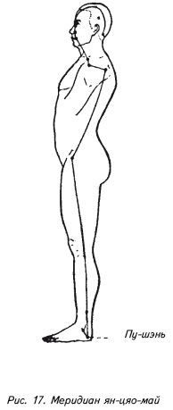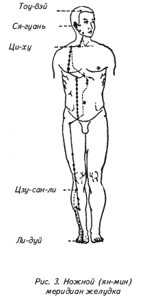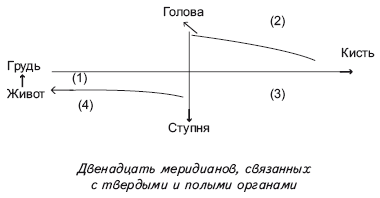 • три ножных ян-меридиана простираются от головы и через ногу соединяются с тремя ножными меридианами; три ножных инь-меридиана тянутся от ноги и через грудь соединяются с тремя инь-меридианами руки.