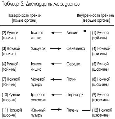 Связь между поверхностными и внутренними частями двенадцати меридианов и их последовательность показаны в табл. 2.