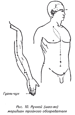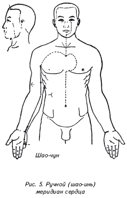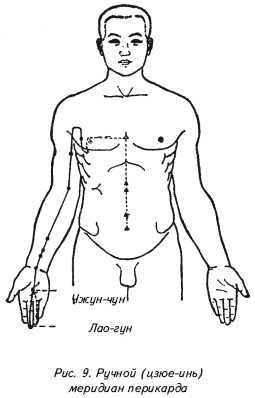 • три ручных инь-меридиана простираются от груди через руку, где соединяются с тремя ручными ян-меридианами;