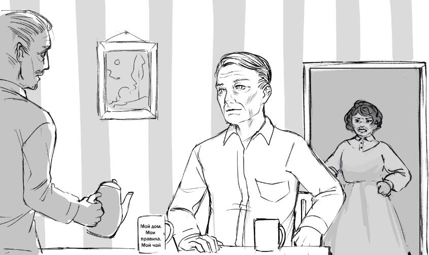 На кухню заходит разъяренная жена друга.