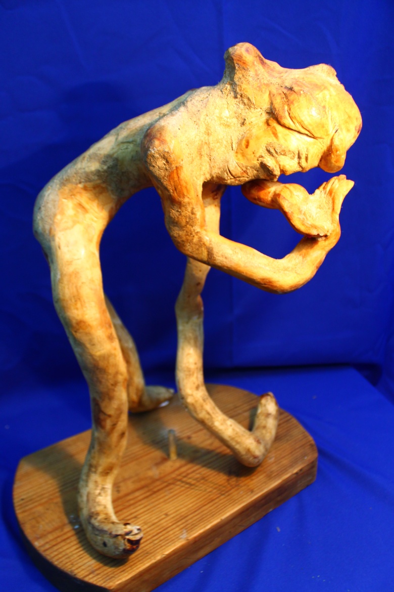 Работу художник выточил из куска дерева, по эскизу. Натурщика у него не было. Вернее, пострадавших от ядерных испытаний в нашем краю много, художнику остается лишь удержать их особенности в памяти. Эту скульптуру, как впрочем и любую надо разглядывать со всех сторон и тогда можно определить причину случившегося – постаментом для этой скульптуры является «гриб» ядерного взрыва.