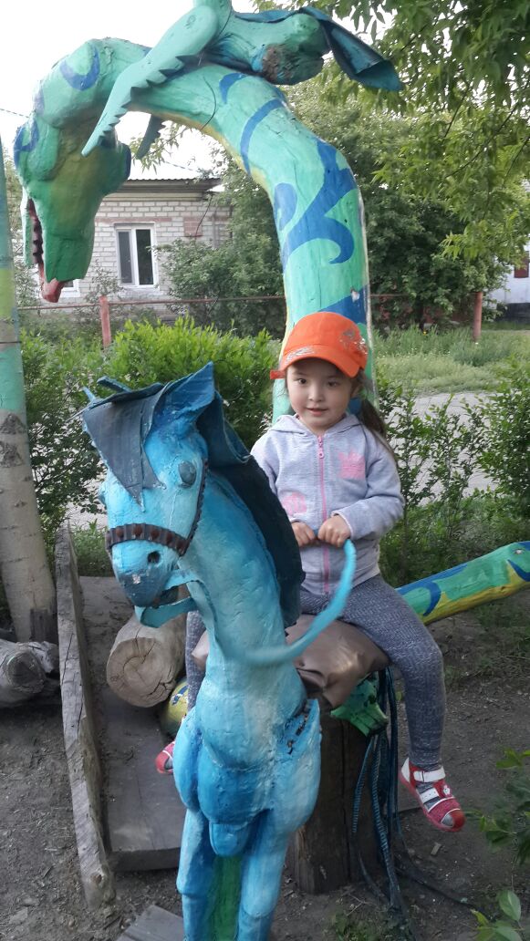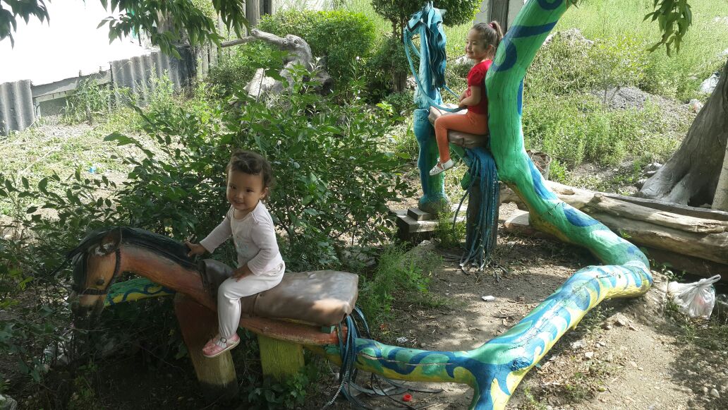 Старенький заброшенный полуподвальный домик, который много лет стоял, как прогнивший зуб во рту, вызывая ужас у окружающих, Курман превратил в веселый улыбающийся дом. Вырастив перед его фасадом живую изгородь из кустарников, сделал детскую площадку, поместив там персонажей казахской сказки, выточенных из дерева. Даже скамейки не обычные, ослик, лошадка… Хорошо ребятам, весело.