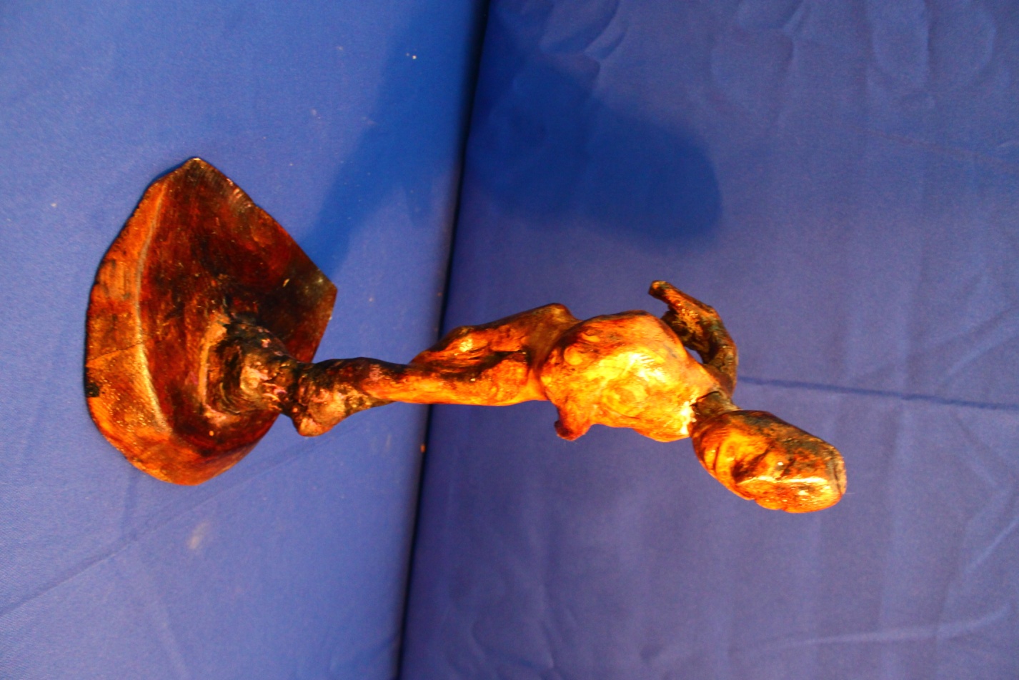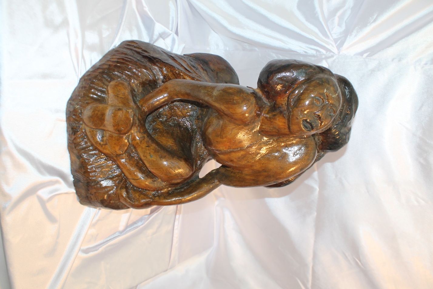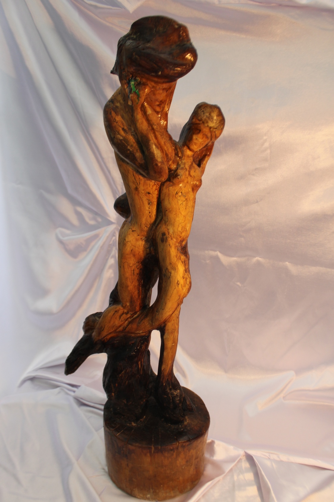 Символическая судьба у этой скульптуры, Среди дров, приготовленных на сжигание, лежал сучок, на котором едва заметно вырисовывались девичья грудь и живот. Курман схватил сучок. Нет, он не должен был сгореть! Не мог! Он не зря попал на глаза. Эскизы, эскизы, эскизы, сучок воплощался в любовь. А любовь сильнее смерти! Это стало лейтмотивом выставки.
