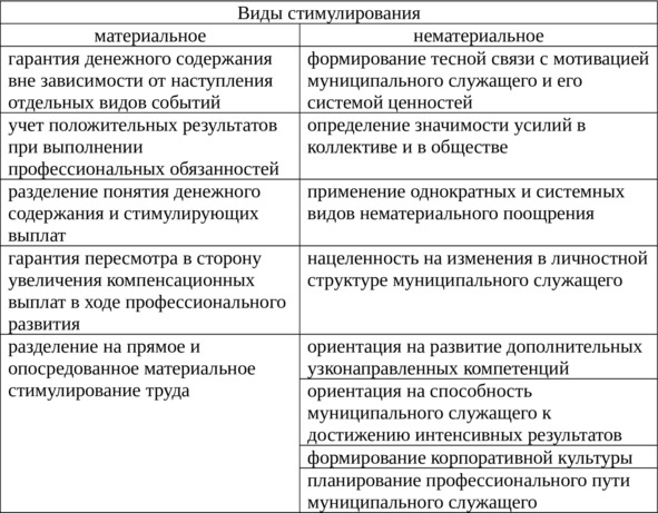 В Таблице 2 представлены отличительные подходы к материальному и нематериальному стимулированию муниципальных служащих.