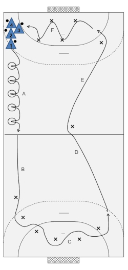 - Put five hoops on the floor of the bottom half of the court, at a short distance to each other. Define the running paths with cones as shown in the figure.