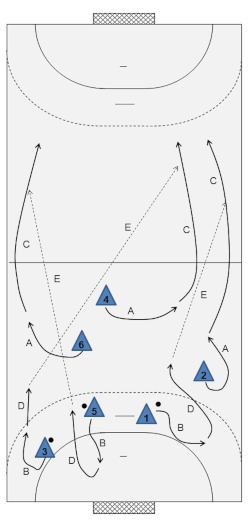 - The players without a ball crisscross outside of the 9-meter zone in the bottom half of the court and do different running moves (hopping, sidestepping...) (A).