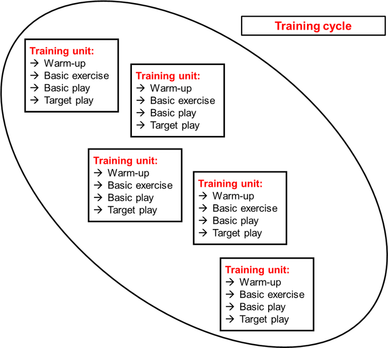 - Opening of the training unit: It may be advisable to start the training unit with a ritual (get together in a circle, exchanging high-fives) and to explain the contents and the objectives of the training unit to the players.