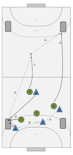 - If the previous defending team wins the ball, the teams change the half of the court (E and F). Now the players have to lay down the ball on one of the mats in the other half (G and H).