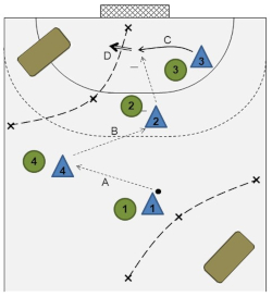 - By playing quick passes (A and B) and moving in a well-coordinated manner (C), the team in ball possession tries to put a player in a good shooting position (D).