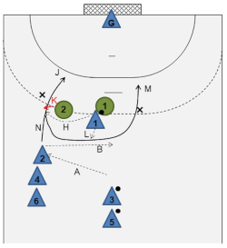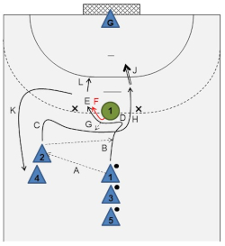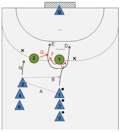 - Only if a direct breakthrough is impossible, he should pass the ball into the crossing movement path (G).