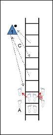 → Jump out of the ladder and land with feet to the left and right of the ladder (A)