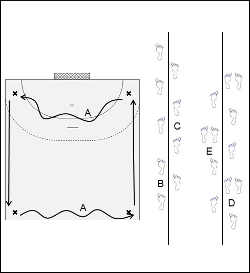→ Jump with the right leg, jump with the left leg, jump and land on both feet (D). The players must always jump over the line. Repeat the course; however, the players always must start with the right leg (E) and so on.