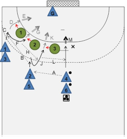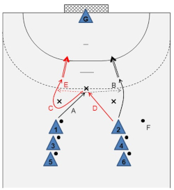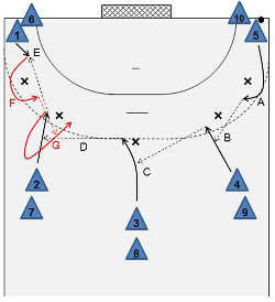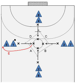 - The players should pass the ball from the center back position to the right/left back position and to the wing position while doing the piston movement (A and B).