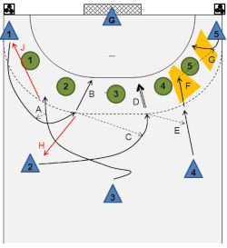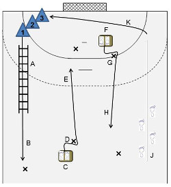 - Afterwards, the players repeat the course at the next small vaulting box (F, G, and H), but now they should run to the left once they have landed (G).