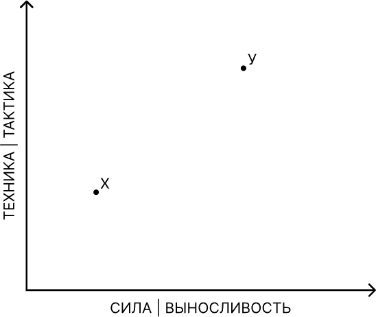 Итак, вернемся к нашему примеру. Представим X и У на графике. Мне нравится рисовать графически, так картина лучше проясняется. Важно понимать, что в этом нет ничего плохого и унизительного. Плохо и унизительно не проводить анализ, плыть по течению, ничего не менять и в момент встречи с У получить то, что ты заслужил. Вот это действительно катастрофа. Но ЧА учит нас, что правильный подход и выполнение всех заданий для улучшения своих показателей дают нам шанс как минимум дать бой У.