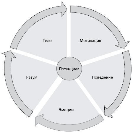 Итак, «я» можно представить состоящим из пяти различных частей, расположенных в виде колеса: мотивации, поведения, эмоций, разума и тела (последнее хранит в себе опыт из нашего прошлого).