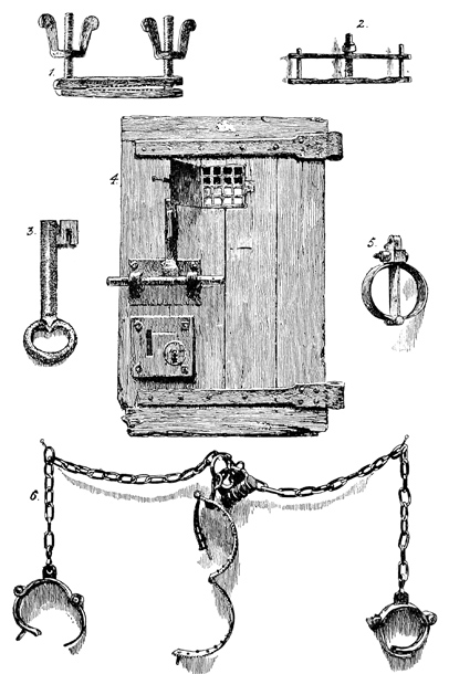 Подборка предметов из Бастилии и других французских тюрем наводит на мысли об ожидающих там пытках. Примечательнее всего, пожалуй, расположенная в центре изображения тюремная дверь: врата в мир боли, а нередко и прочь из земного существования