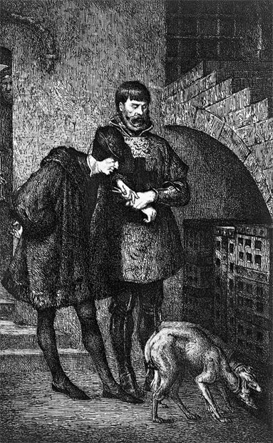 Король Франции Людовик XI наклоняется, чтобы поговорить со своим узником, кардиналом Балю. Последнего он держал в клетке, как животное, с 1469 по 1480 г. Это было не просто намеренным причинением дискомфорта, но и подчеркнутым принижением статуса Церкви