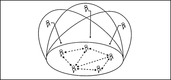 Схема № 9: «Структурная схема организационно-технической системы с несколькими конкурирующими фокусами организации, руководства или управления». «Хрестоматия по работам Г. П. Щедровицкого. Путеводитель по основным понятиям и схемам методологии организации, руководства и управления». Стр. 181.