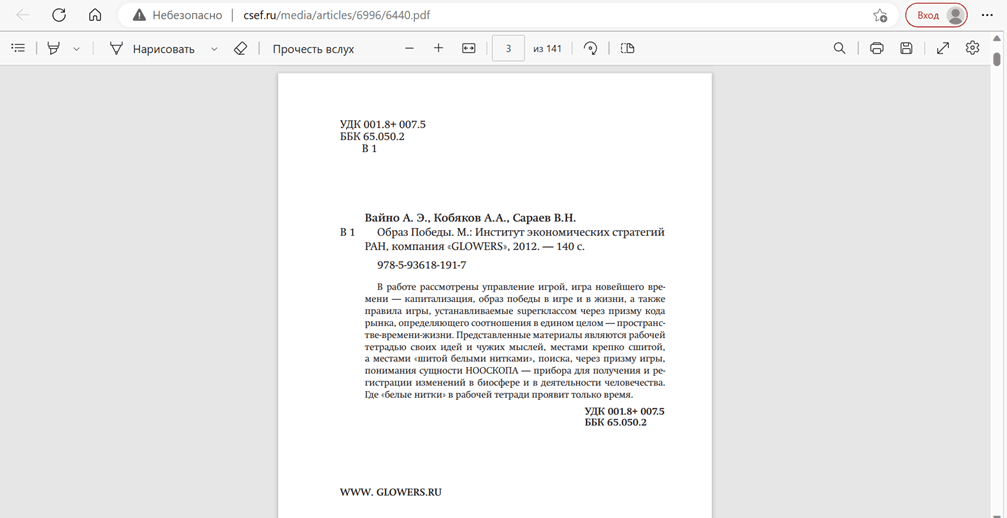 Скриншот № 1: «Страница № 2 книги «Образ победы». Вайно А. Э., Кобяков А. А., Сараев В. Н. «Центр стратегических оценок и прогнозов» (http://csef.ru/media/articles/6996/6440.pdf).