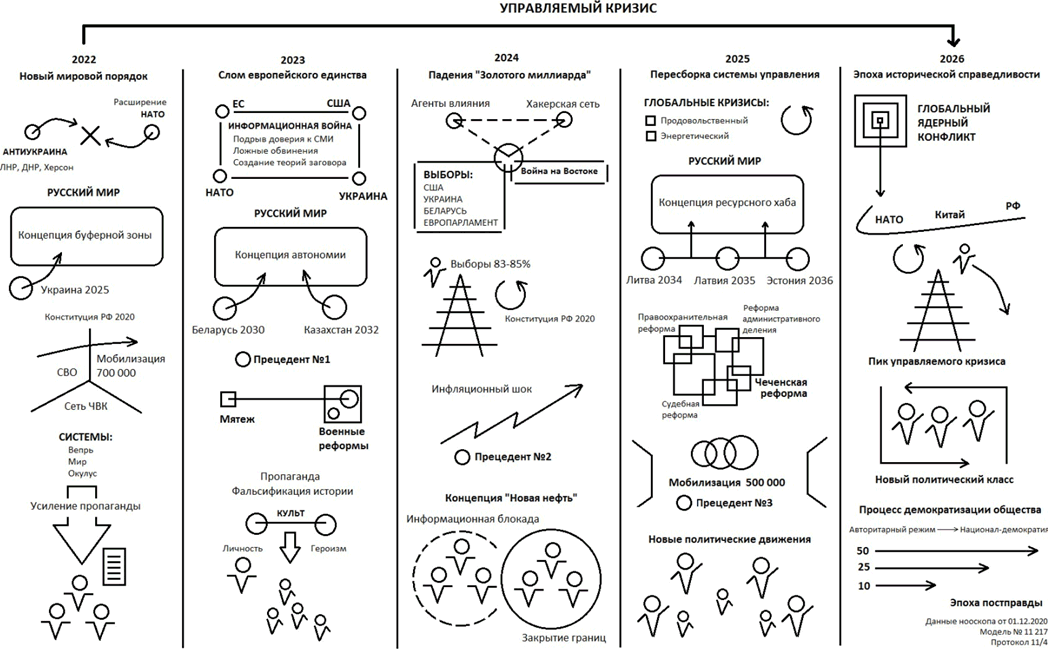 Схемы, изображенные на сайте, датируются 01.12.2020. На них рассказывается о будущих событиях во внешней и внутренней политике России на рубеже 2022–2026 годов. К концу 2023 года все описанное на схемах стало реальностью: например, события в Украине, мобилизация в России, «Марш справедливости» Евгения Пригожина и многое другое. В 2024–2026 годах Россию, согласно информации на схемах, ждут экономические потрясения, государственные реформы, глобальный ядерный конфликт и ряд других не менее масштабных событий. При этом никакой другой информации, кроме схем, сайт на момент написания книги не содержит.