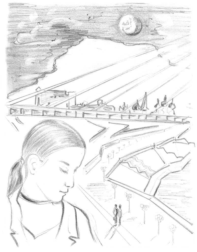 Солнце давно уже скрылось за горизонт, и в небе светила полная луна. Бледный лунный свет словно окутывал набережную своими лучами, придавая ей таинственный вид. А тишина, окутавшая все вокруг, вызывала ощущение чего-то затаившегося.