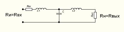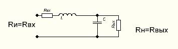 Фильтр состоит из двух элементов: L и C. Входное сопротивление Rвх и выходное сопротивление фильтра Rвых показаны на схеме условно. Фильтр подключается к некоторому источнику с выходним сопротивлением Rи. К выходу фильтра подключается нагрузка Rн. При расчете фильтра обязательно должны быть согласованы входное и выходное сопротивления фильтра: Rвх=Rи, Rвых=Rн.