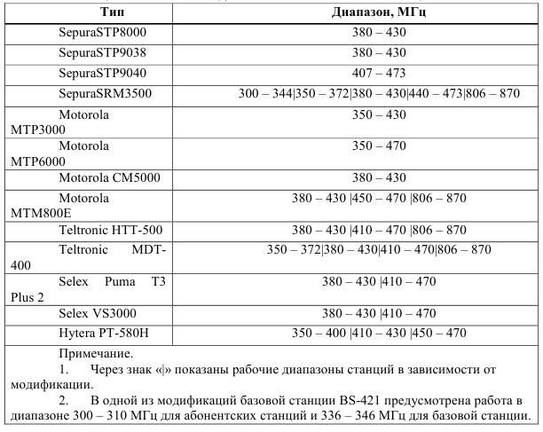 В таблице 1 приведены частотные диапазоны абонентских станций ТЕТРА.