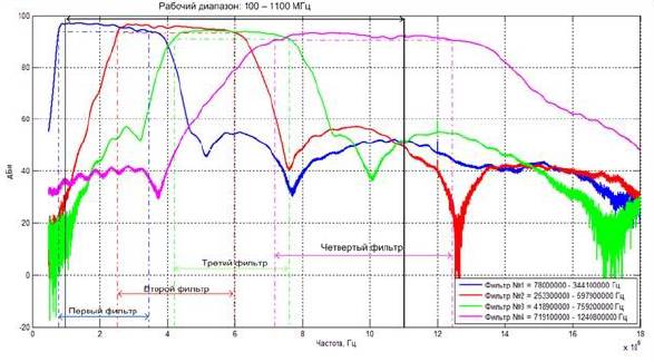 Как видно из рисунка 6, рабочий диапазон радиоприемника хорошо перекрывается четырьмя выбранными фильтрами преселектора. Полосы частот, в которых в настоящее время работают радиостанции стандарта ТЕТРА, полностью попадают во второй и четвертый поддиапазоны преселектора, поэтому переключение поддиапазонов при измерении параметров излучений не потребуется. Формы, полученных АЧХ, достаточно близки к прямоугольным, что обеспечит малые искажения сигнала в полосе пропускания и хорошее подавление сигнала вне полосы пропускания.