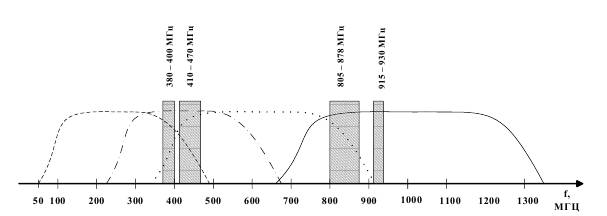 Рисунок 4 – Поддиапазоны работы станций TETRA и АЧХ поддиапазонов преселектора