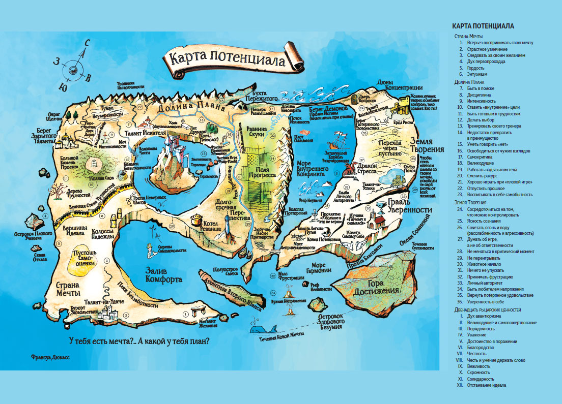 Цифры, расположенные на карте в виде маршрута с указателями, соответствуют 36 зонам потенциала, перечисленным в легенде. Это качества и базовые понятия, связанные с достижением результата, которые, на наш взгляд, полезно проанализировать и представить в виде удобных карточек (см. часть IV). Таким образом, потенциал превращается в путь, и мы призываем каждого ступить на него и пройти по нему шаг за шагом, подобно рыцарю, идущему в поход.
