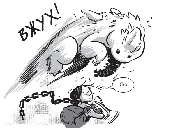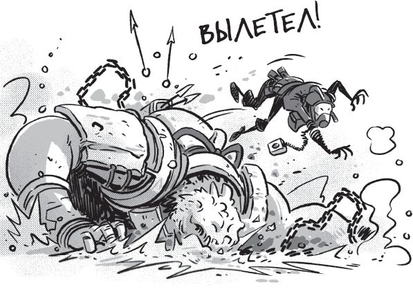 Руль вылетает и едва не лишает меня левого уха. Мой шикарный новенький щит трескается. Копье, висящее за спиной, ломается пополам. Но есть и хорошие новости. Я опускаю взгляд и кричу…