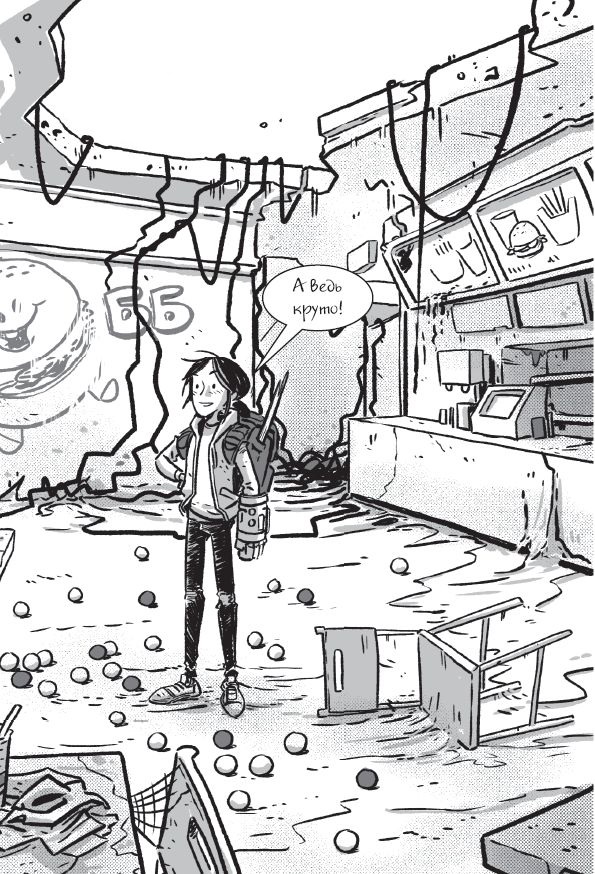 Оглядевшись, я замечаю старый музыкальный автомат, аппарат с газировкой и статую Сэра Блупер-Бургера. Голова у него свисает с плеч, а жуткие пальцы в форме картошки фри обломаны.