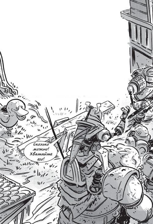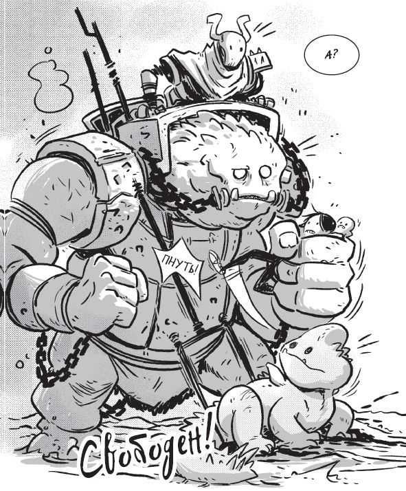На нем шипованные доспехи, все в пятнах от машинного масла, и воняет он так, что это чувствую даже я в своем укрытии. Рифтер бросается вперед, направляя на существо зазубренное лезвие. Но существо откатывается в сторону, и рифтер спотыкается.