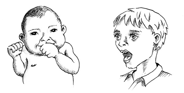 Свои эмоции выражают даже младенцы. Лицо младенца слева выражает удовольствие от сосания своего пальца так же ясно, как лицо мальчика справа выражает страх. Оба эти рисунка подтверждают, что наши шесть эмоциональных выражений лица, многие из которых свойственны и нашим братьям-приматам, могут быть жестко запрограммированы в нашем мозге.