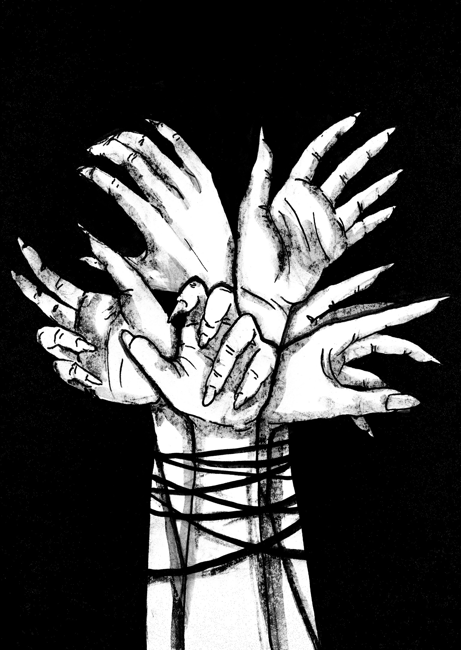 Полотно отображало анорексичных, полунагих юношу и девушку, стоящих друг перед другом. Меж ними были натянуты две нити, одна от межножья к межножию, другая от груди до груди. По нижней, в сторону девушки, бежал маленький, восторженный мальчик. По верхней, в сторону юноши, бежала маленькая, восторженная девочка. Но когда дети почти добегали до конца, их ногтем сталкивали вниз. Заманикюренный ноготь девушки сталкивал мальчика, а холеный ноготь юноши – хрупкую, тонкую девочку… и внизу, в ногах, печально синела горка из окровавленных трупиков.