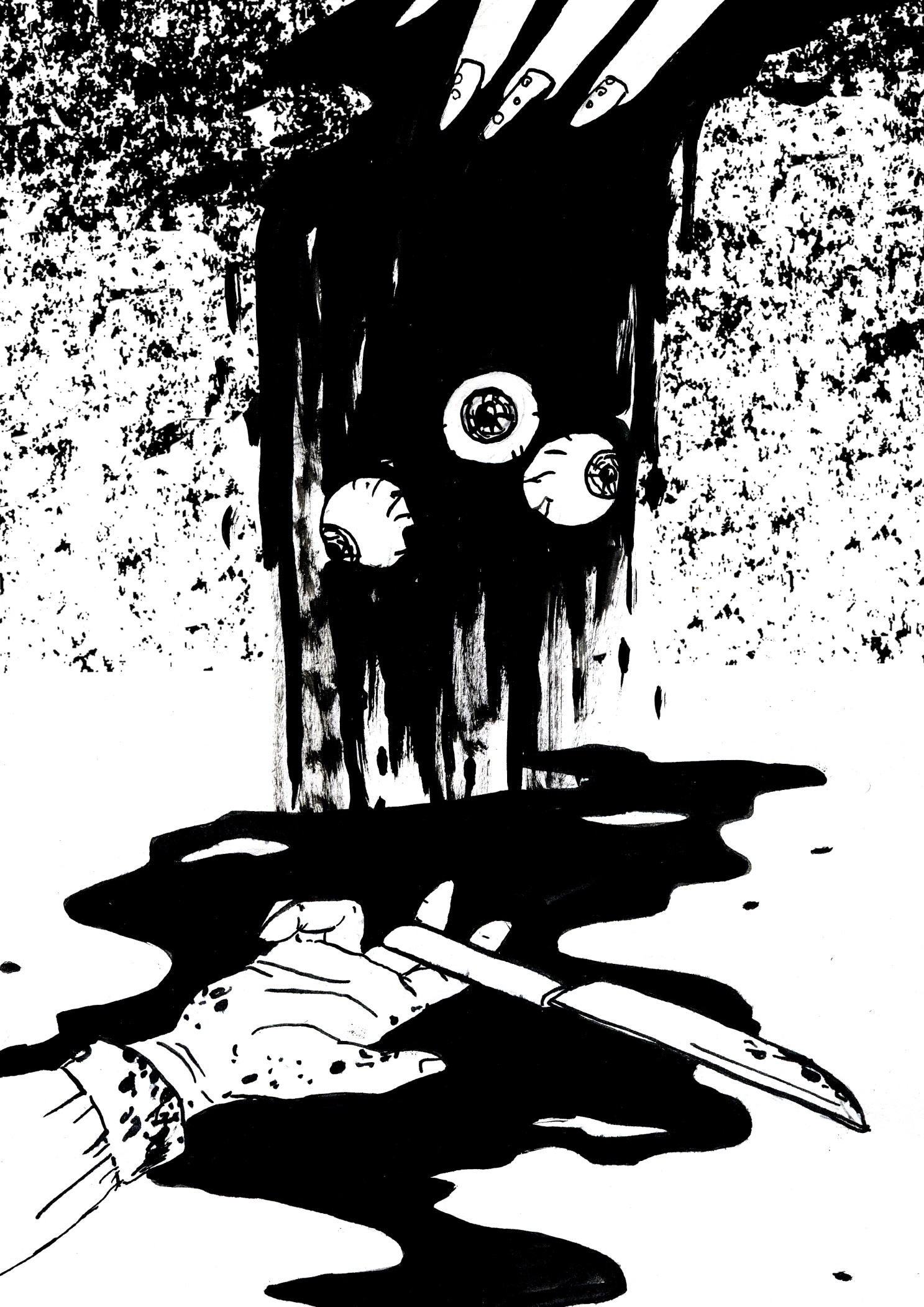 Тут он услышал крики, увидел как к нему бегут охранники…, но он радовался, он удовлетворенно улыбался, наверное первый раз в жизни глядя на свое гениальное творение… Ему казалось что слава, слава снизошла к нему… Художник достал кухонный нож, отошел от жуткой натуры и театральным жестом, кровавыми руками вонзил его, себе, в грудь…