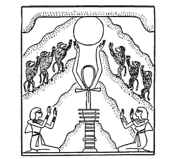 Рис. 14. Павианы, приветствующие утреннее солнце. Солнце поднимается в восточных горах из атрибутов Осириса