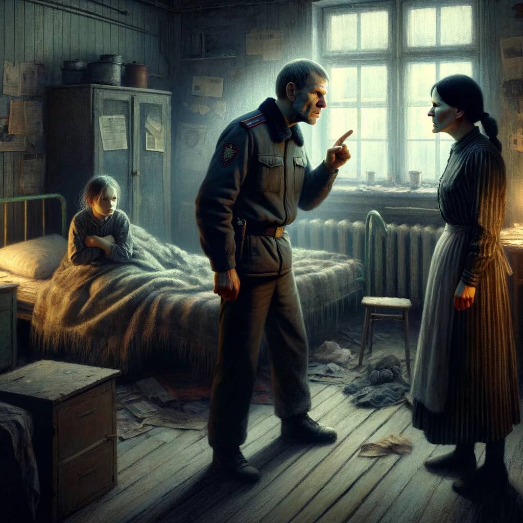Мила, притаившись за углом коридора, сжимала кулаки от напряжения, пытаясь уловить каждое слово сквозь звуки дождя, стучащего в окна. Она наблюдала, как мрачные тени двух фигур сотрудников органов опеки проступали сквозь матовое стекло входной двери, словно призраки, пришедшие из другого мира.