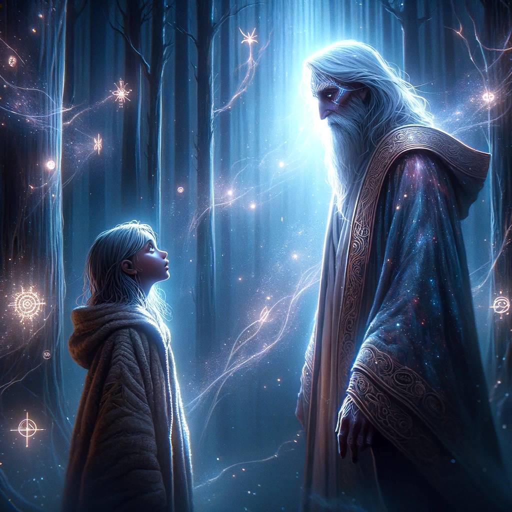 В ночь, когда Мила укрылась в объятиях сна после очередной ссоры с мамой, ее воображение родило Творца – существо, олицетворяющее защиту и любовь, которых так не хватало в ее жизни. Величественная фигура возвышалась над ней, его глаза серого цвета излучали бесконечную мудрость и доброту, а его волосы, белоснежные как свежевыпавший снег, нежно колыхались в ритме его движений. Его голос, глубокий и успокаивающий, был похож на мелодию, которая могла исцелить душу. Мантия, окутывающая его фигуру, пульсировала оттенками тьмы и света, создавая ореол загадочности.