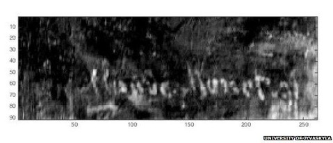 на изображении ниже – выявленная скрытая подпись Клода Моне на недавно обнаруженной картине Клода Моне «Стог сена в вечернем солнце», фото – Университет Ювяскюля (University of Jyvaskyla), Финляндия