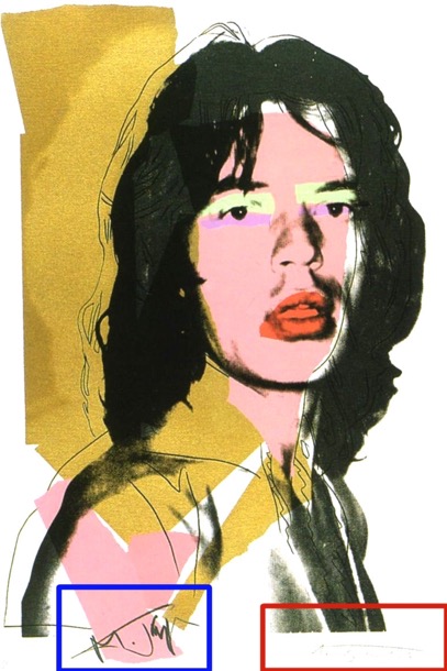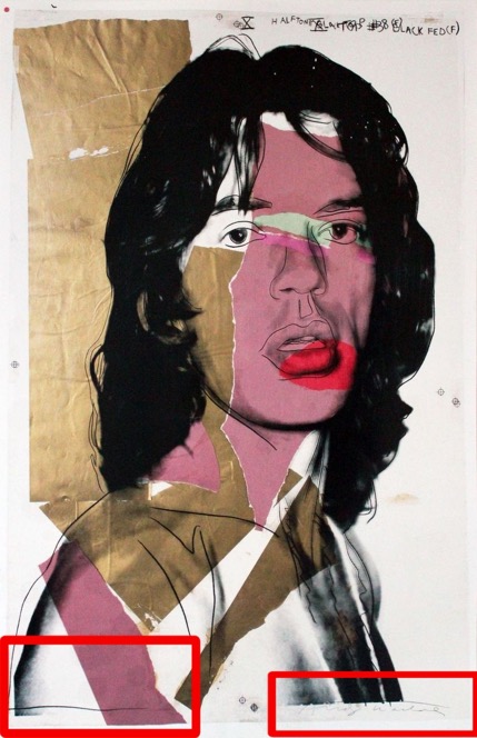 – в красных прямоугольниках – расположение идентифицированных подписей Энди Уорхола и Мика Джаггера