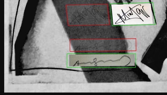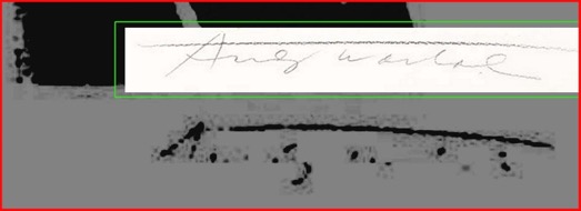 – в зеленом прямоугольнике – образец подлинной подписи Энди Уорхола, доступный из архивов в интернете (Приложение 3: Список подлинных подписей художников).